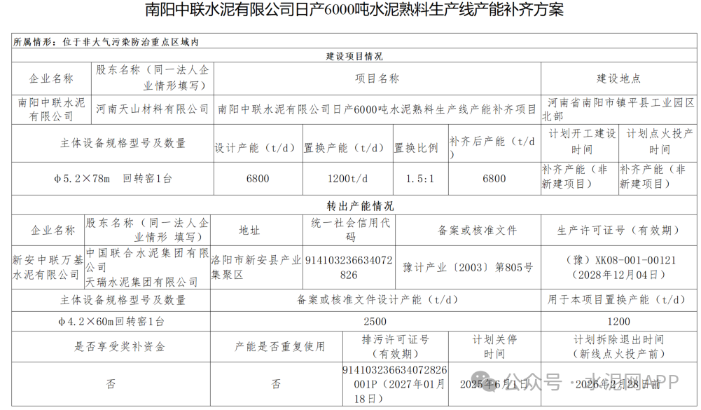 根據公示,南陽中聯水泥6000t/d補充800t/d產能至6800t/d,退出生產線來自新安中聯萬基水泥2500t/d(1200t/d用于本項目)生產線,置換比例1.5:1。