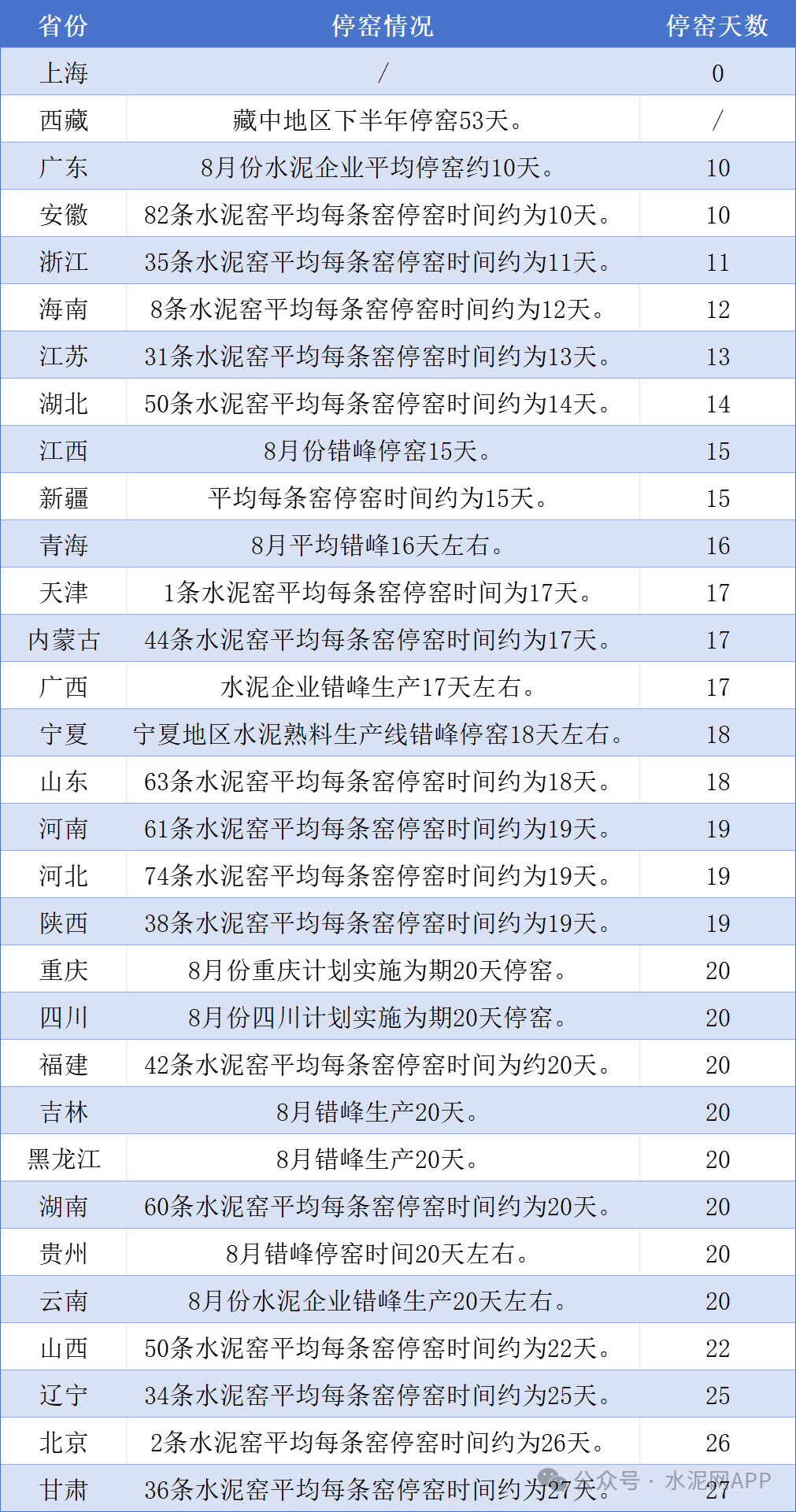 另據(jù)市場反饋,福建地區(qū)水泥企業(yè)計劃9月錯峰停窯18天;河南省水泥企業(yè)8月15號起停窯20天;湖南9月1日-12月31日錯峰生產天數(shù)基數(shù)不少于70天;云南計劃三季度累計停窯50天;東北地區(qū)9月繼續(xù)執(zhí)行錯峰計劃,停窯天數(shù)在15天左右...