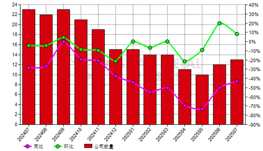2025年1-7月,13家生產商共計生產125,300.00公噸,平均開工率5.47%。