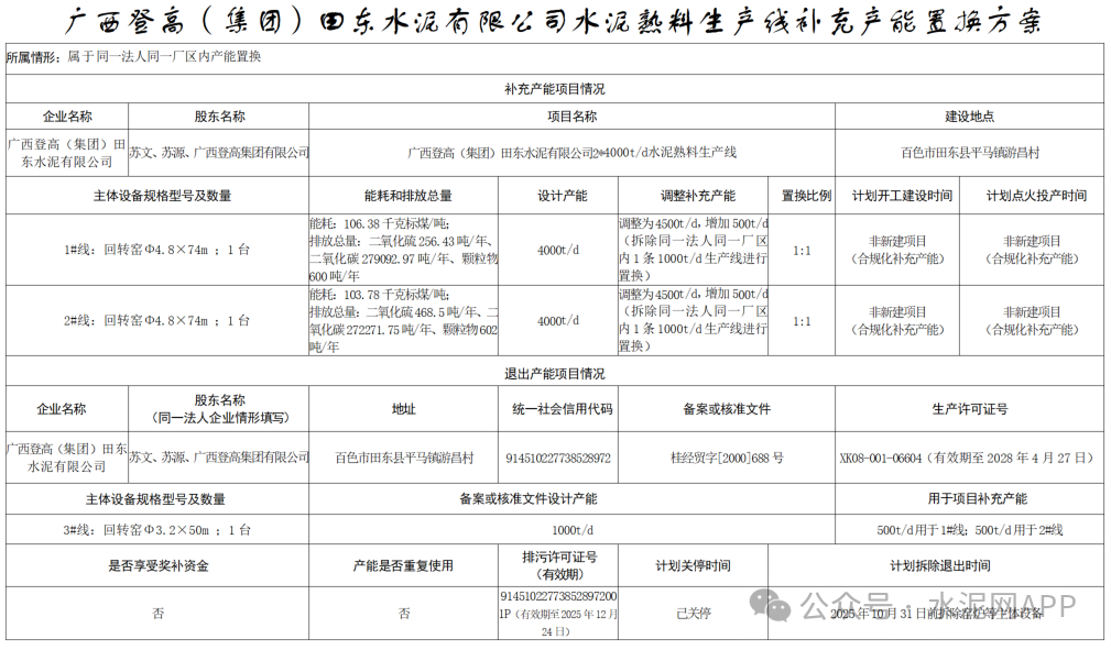 廣西登高(集團)田東水泥1#、2#4000t/d生產線各補充產能500t/d,退出產能來自同公司3#1000生產線,置換比例1:1。