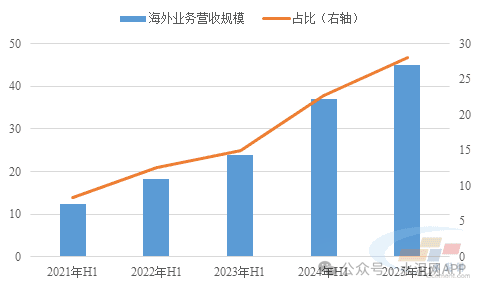 圖:2025年上半年華新水泥海外業務營收規模及占比(單位:億元、%)