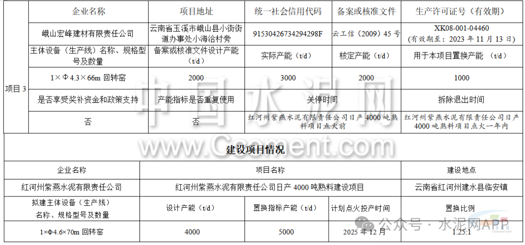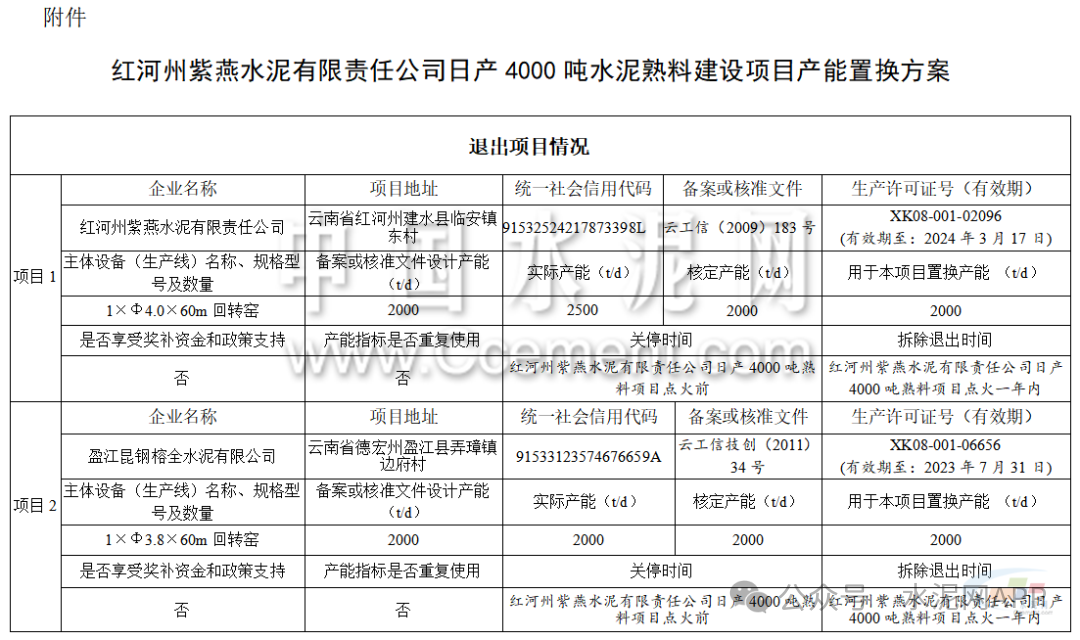 9月11日,云南省工信廳發(fā)布第18號、第19號公告。因故未實(shí)施,紅河州紫燕水泥有限責(zé)任公司申請撤銷“紅河州紫燕水泥有限責(zé)任公司日產(chǎn)4000噸水泥熟料建設(shè)項(xiàng)目產(chǎn)能置換方案”。按照原計(jì)劃,該企業(yè)擬建一條4000t/d熟料生產(chǎn)線項(xiàng)目,退出紅河州紫燕水泥有限責(zé)任公司2000t/d、盈江昆鋼榕全水泥有限公司2000t/d、峨山宏峰建材有限責(zé)任公司2000t/d共計(jì)3條生產(chǎn)線。
