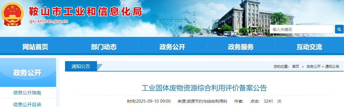 按照工信部《工業固體廢物資源綜合利用評價管理暫行辦法》、《國家工業固體廢物資源綜合利用產品目錄》、省工信廳《遼寧省工業和信息化廳關于做好工業固體廢物資源綜合利用評價工作的通知》(遼工信資源〔2023〕129號)及《鞍山市工業固體廢物資源綜合利用評價管理實施辦法》要求,2025年9月3日-2025年9月9日,我局對鞍山廈美環保科技有限公司、鞍山昊通新材料有限公司、鞍鋼綠色資源科技有限公司工業固體廢物綜合利用評價進行備案公示。截至公示期結束,未收到不同意見,現予以公布。