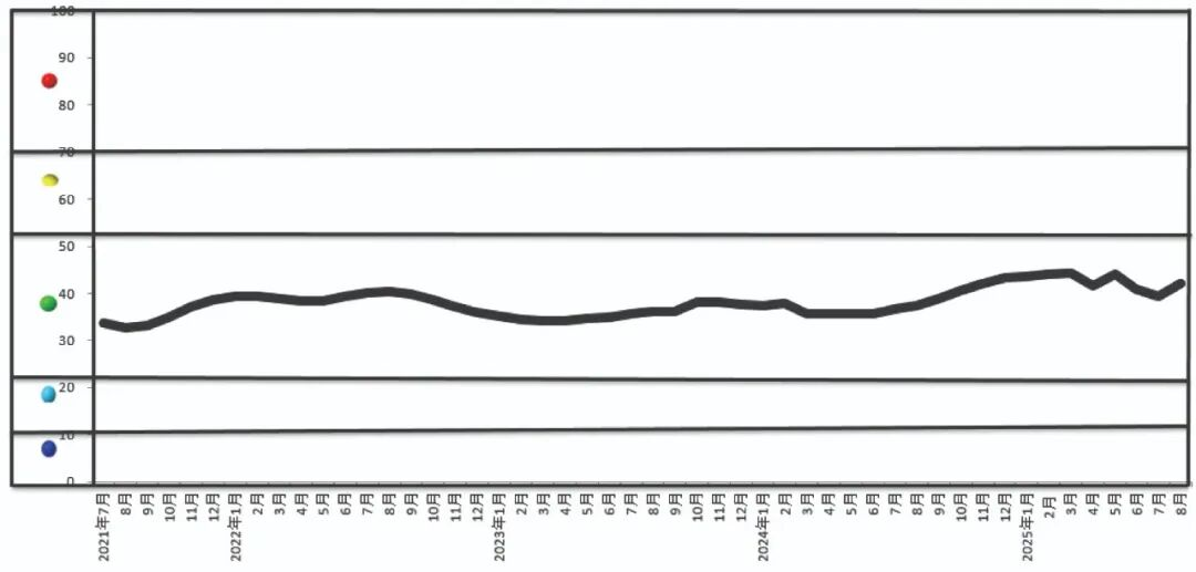 中國銅產業月度景氣指數監測模型結果顯示,2025年8月份,中國銅產業月度景氣指數為42.0,較上月上升2.7個百分點,繼續保持在“正常”區間運行;先行指數為79.6,較上月下降0.1個百分點;一致指數為78.2,較上月上升4.4個百分點。最近13個月中國銅產業月度景氣指數見下表。
