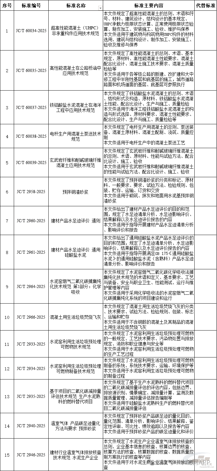 公示名單顯示,在本次公示的117項行業標準中,含建材行業標準34項,其中15項與水泥、混凝土、砂漿相關。