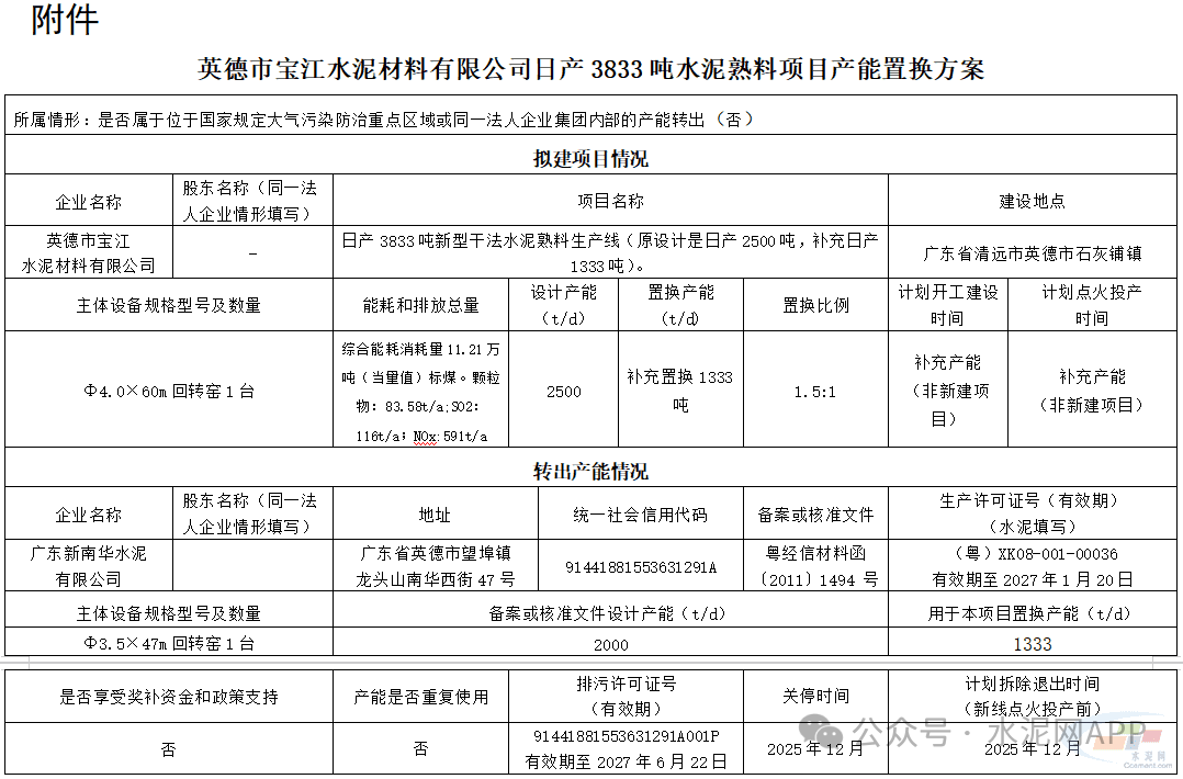 置換方案顯示,英德市寶江水泥2500t/d熟料線補充產能1333t/d,補充后產能為3833t/d,退出產能來自廣東新南華水泥有限公司一條2000t/d熟料生產線,置換比例1.5:1。