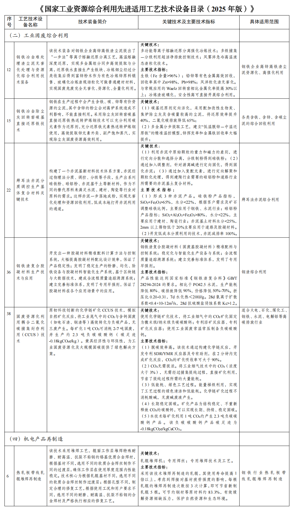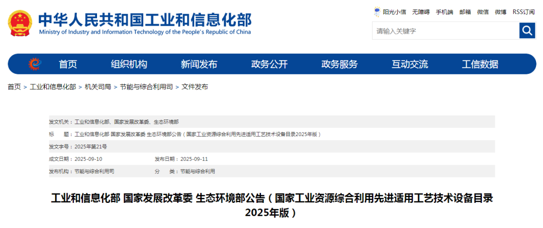 9月11日,為加快推動(dòng)工業(yè)固廢源頭減量和規(guī)模化利用,提升再生資源綜合利用水平,發(fā)展高端智能再制造,工業(yè)和信息化部、國家發(fā)展改革委、生態(tài)環(huán)境部編制了《國家工業(yè)資源綜合利用先進(jìn)適用工藝技術(shù)設(shè)備目錄(2025年版)》,于工信部官網(wǎng)進(jìn)行了公示。
