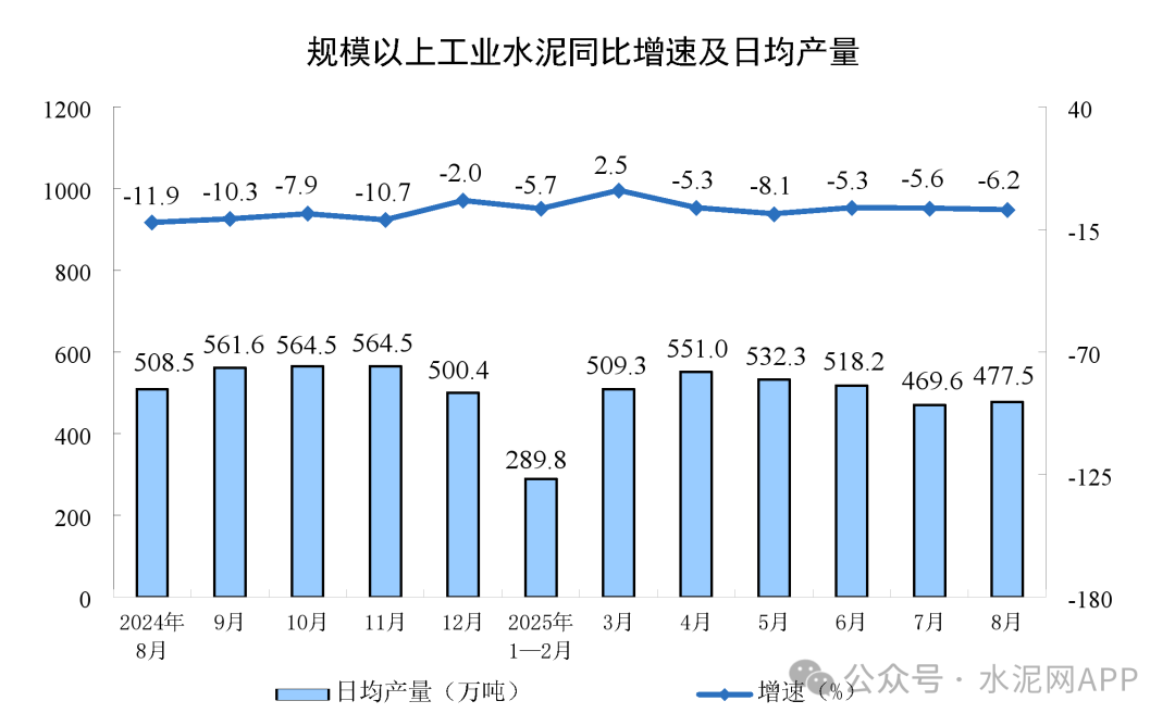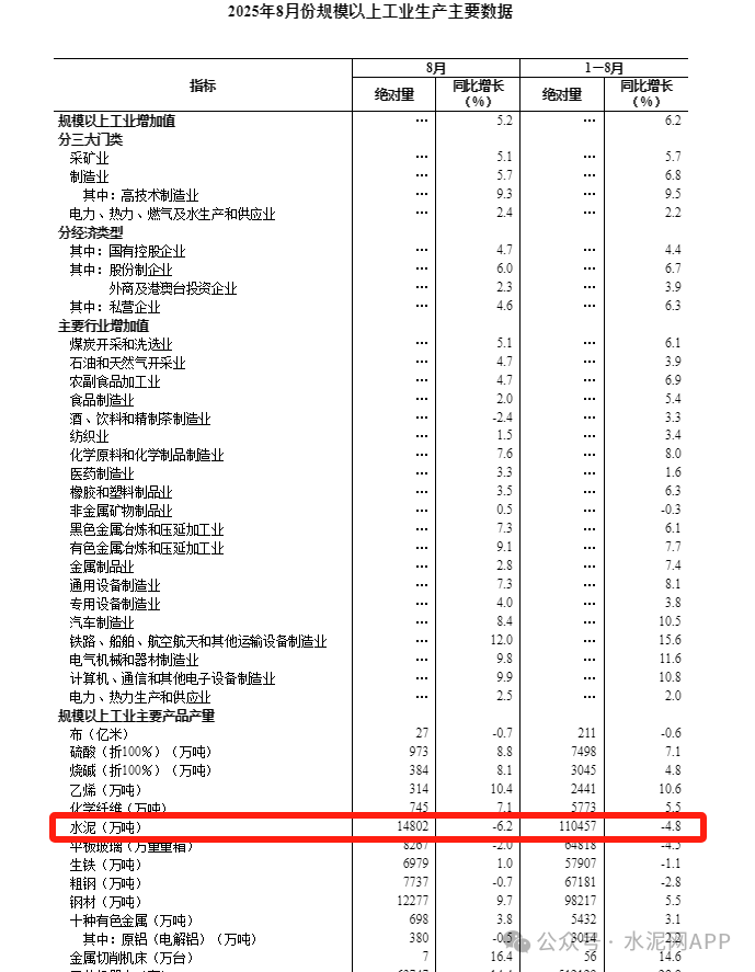 據國家統計局數據,8月份,規模以上工業增加值同比實際增長5.2%(增加值增速均為扣除價格因素的實際增長率)。從環比看,8月份,規模以上工業增加值比上月增長0.37%。1—8月份,規模以上工業增加值同比增長6.2%。其中水泥行業8月份全國水泥產量14802萬噸,同比下降6.2%;1-8月全國水泥產量110457萬噸,同比下降4.8%。此外,數據顯示,2024年1-8月全國水泥產量為115907萬噸,由此計算,今年1-8月水泥全口徑產量比去年同期減少5450萬噸,降幅4.7%。
