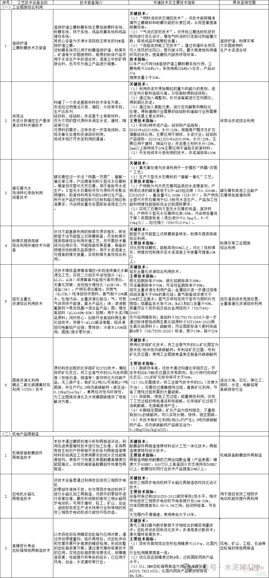 本次公告發布了《國家工業資源綜合利用先進適用工藝技術設備目錄(2025年版)》。據該目錄顯示,其中包含9項與水泥行業相關先進適用工藝技術設備,分別是:濕排爐渣立磨粉磨技術及裝備、拜耳法赤泥分質調控生產基體復合材料關鍵技術、磷石膏汽水熱液轉化綠色利用成套技術、粉煤灰提質降碳綜合利用關鍵技術與裝備、鋁灰全量化資源綜合利用技術、固廢資源化利用耦合二氧化碳捕集封存利用(CCUS)技術、機械裝備耐磨部件再制造技術、舊電機永磁化再制造技術、高精密長壽命齒輪箱綠色再制造技術。