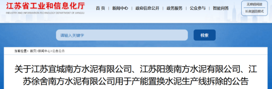 9月12日,江蘇省工信廳發(fā)布“關于江蘇宜城南方水泥有限公司、江蘇陽羨南方水泥有限公司、江蘇徐舍南方水泥有限公司用于產(chǎn)能置換水泥生產(chǎn)線拆除的公告”。