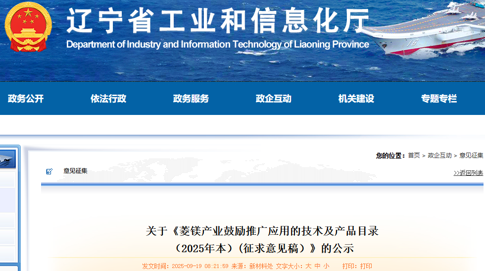 按照《遼寧省人民政府辦公廳關于推進菱鎂行業高質量發展的實施意見》(遼政辦發〔2023〕15號)精神,為持續搭建技術交流平臺,推動新技術、新產品成果轉化,持續提升菱鎂行業高端化、智能化、綠色化水平。經企事業單位自主申報、市工信局推薦,我廳征集了已進入或接近產業化應用階段、有推廣應用意向、暫無社會異議的22項新技術、新產品,經相關專家論證,現將《菱鎂產業鼓勵推廣應用的技術及產品目錄(2025年本)(征求意見稿)》予以公示,公示期為5個工作日。
