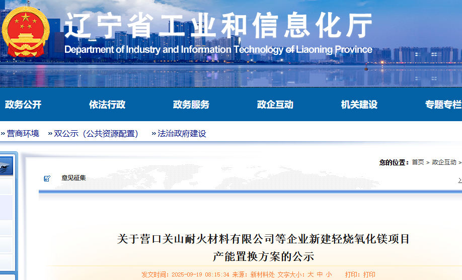 按照《遼寧省人民政府辦公廳關于推進菱鎂行業高質量發展的實施意見》(遼政辦發〔2023〕15號)、《遼寧省菱鎂礦浮選及鎂砂行業產能置換辦法》(遼工信建材〔2024〕18號)要求,根據菱鎂行業專項整治工作進展,經企業申請、市工信部門初審、我廳審核,現將營口關山耐火材料有限公司等企業新建輕燒氧化鎂項目產能置換方案予以公示,公示期10個工作日。