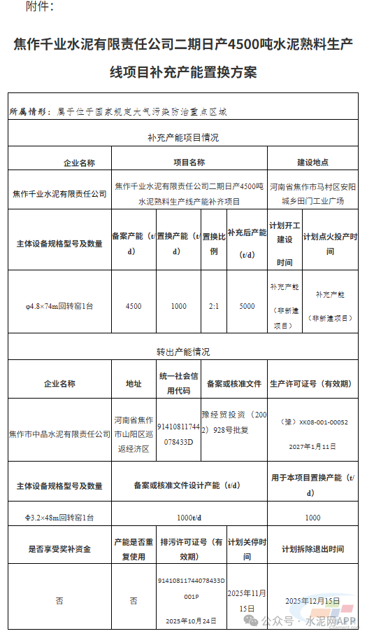 根據公示,焦作千業水泥有限責任公司二期日產4500噸水泥熟料生產線產能補齊項目置換產能1000t/d,補充后產能5000t/d,退出產能來自焦作市中晶水泥有限責任公司1000t/d水泥熟料生產線,置換比例為2:1。