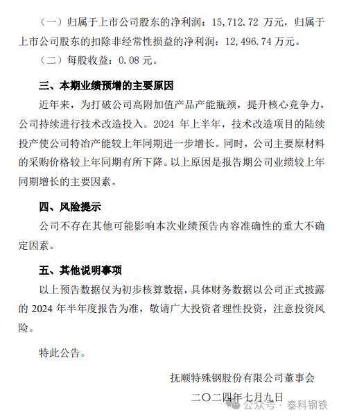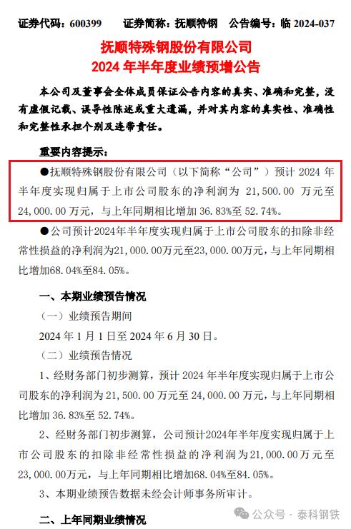 此前,撫順特鋼披露2024年半年度業績預增公告,該公司預計報告期歸屬于上市公司股東的凈利潤為2.15億元至2.4億元,與上年同期相比增加36.83%至52.74%。歸屬于上市公司股東的扣除非經常性損益的凈利潤為2.1億元至2.3億元,與上年同期相比增加68.04%至84.05%。
