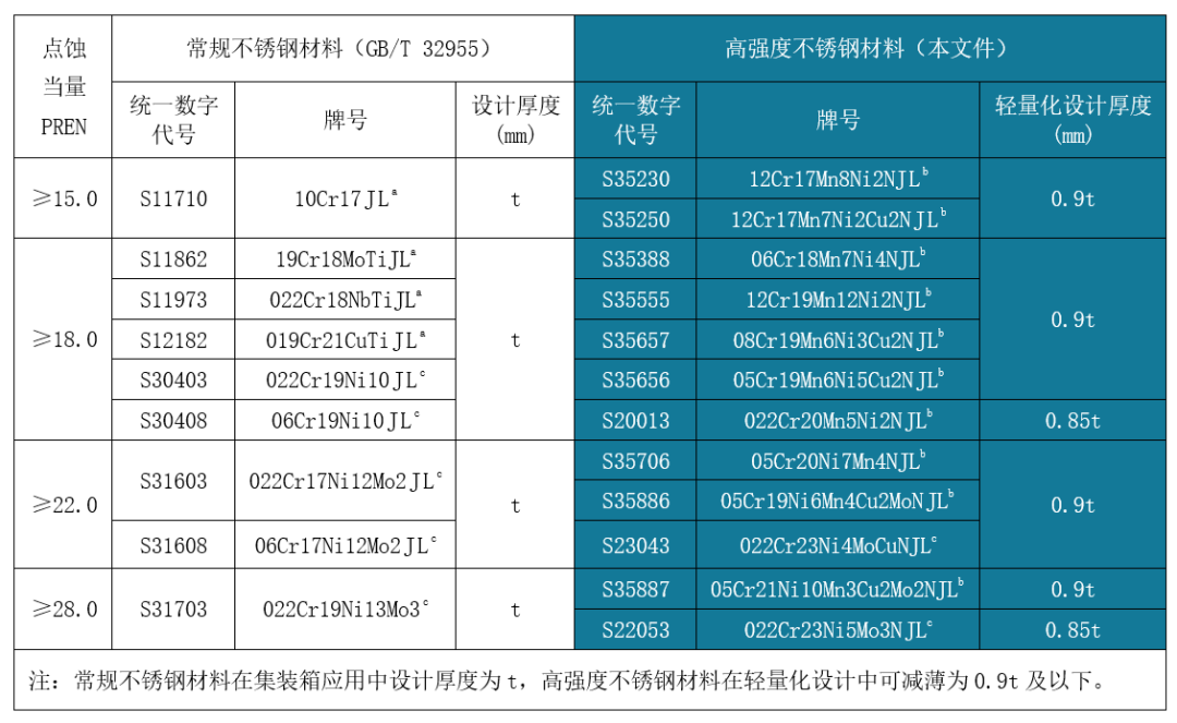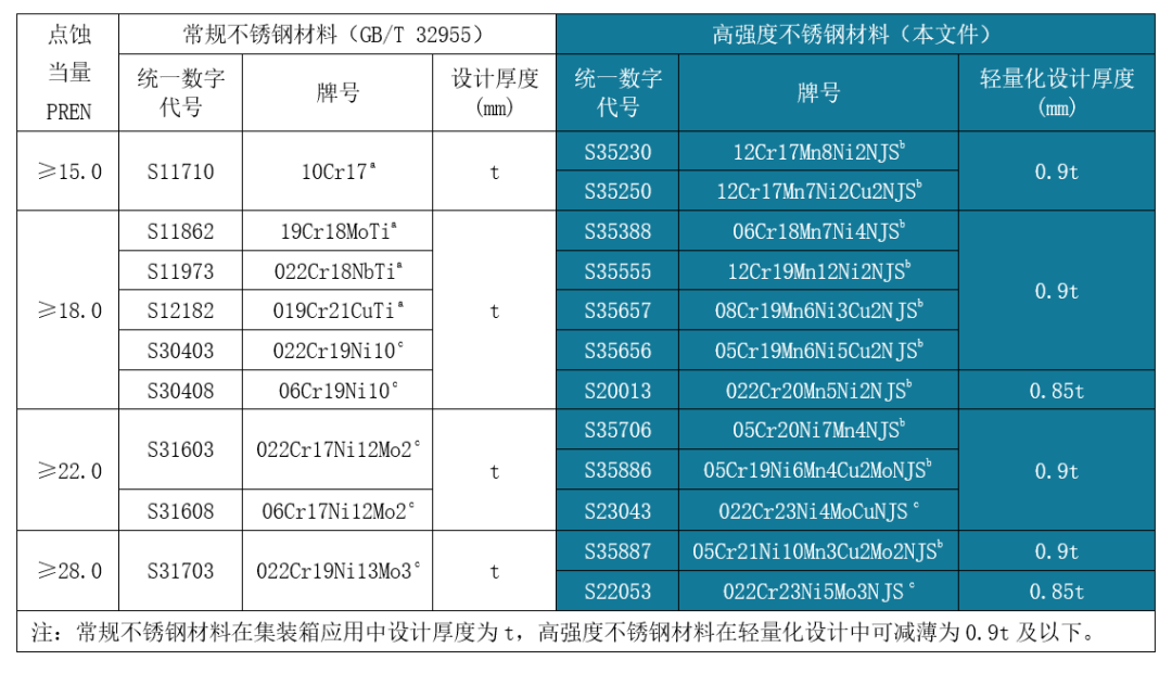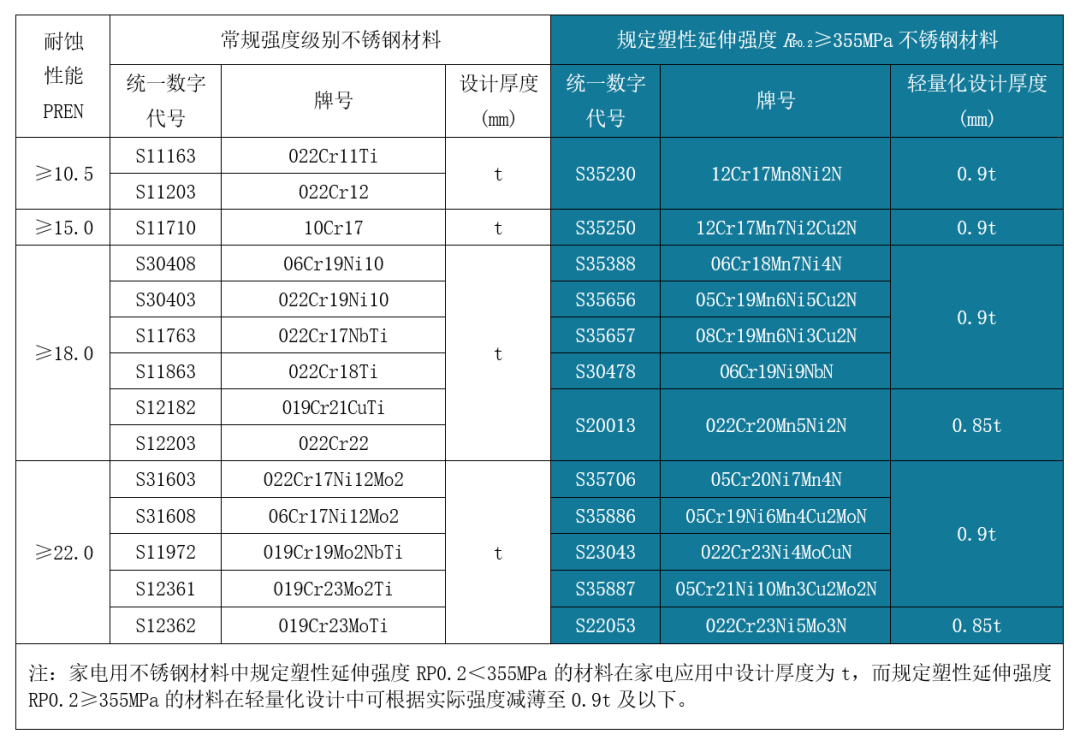 經濟型高強度不銹鋼,包括QN系列奧氏體不銹鋼及QD2001雙相不銹鋼在保持良好耐蝕性、焊接性和冷加工性的基礎上顯著提升了強度,可助推集裝箱及家電等領域的產品輕量化設計。新發布的行業標準中推薦,高強度不銹鋼相對常規產品可減薄10%-15%(詳見表1~表3),這對于產業鏈節能減排和可持續綠色發展具有重要意義。