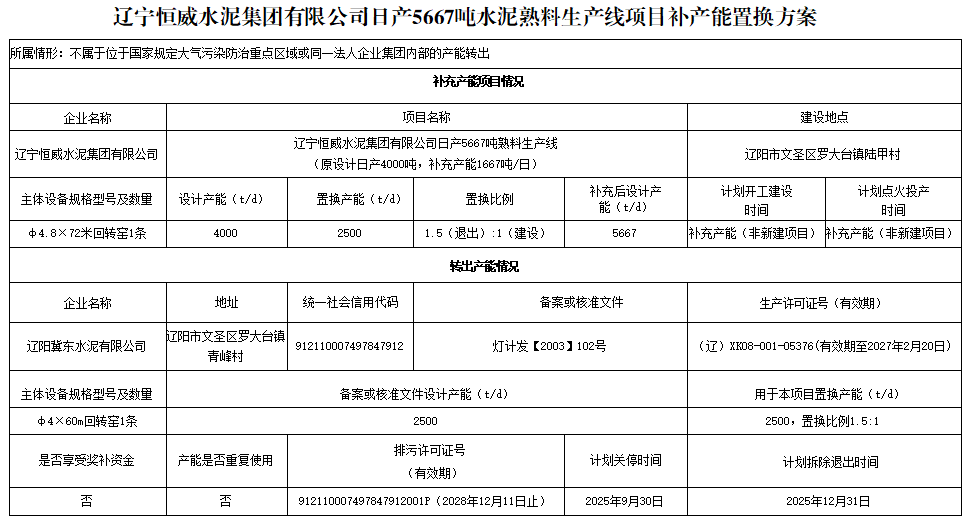 按照工業和信息化部《水泥玻璃行業產能置換實施辦法》(工信部原〔2024〕206號)有關規定及水泥行業產能管理相關政策要求,我廳于2025年9月9日至9月22日對遼寧恒威水泥集團有限公司日產5667噸水泥熟料生產線項目補充產能置換方案進行了公示,公示期間未收到異議,現予通告。