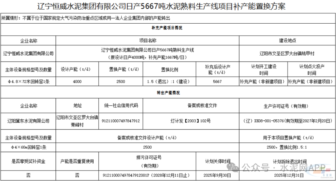 置換方案顯示,遼寧恒威水泥4000t/d熟料生產線補充產能1667t/d,補充后產能為5667t/d,退出產能來自遼陽冀東水泥一條2500t/d熟料生產線。