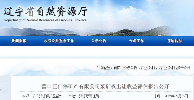 按照《關于完善礦業權出讓收益評估程序的通知》(遼自然資辦發[2022]2號)要求,《營口巨仁偉礦產有限公司采礦權出讓收益評估報告》及相關附件已在省自然資源廳公示10個工作日,無異議,予以公開。
