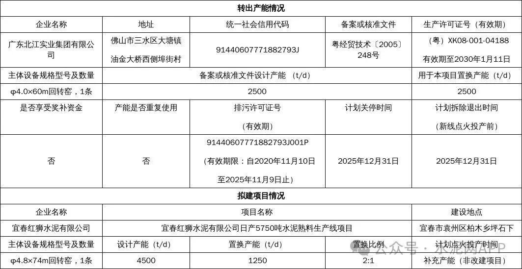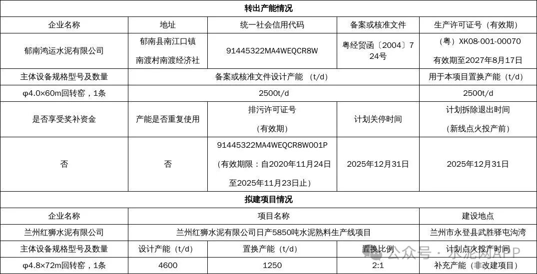 置換方案顯示,廣東北江實業集團轉出一條2500t/d熟料生產線,用于補充宜春紅獅水泥一條4500t/d熟料線,補充后產能為5750t/d。郁南鴻運水泥轉出一條2500t/d熟料生產線,用于補充蘭州紅獅水泥一條4600t/d熟料線,補充后產能為5850t/d。
