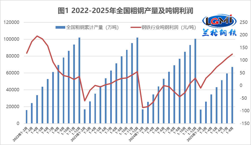 8月份,在經(jīng)濟(jì)運(yùn)行穩(wěn)中有進(jìn)、限產(chǎn)政策逐步落實(shí)、淡季效應(yīng)持續(xù)突顯、成本支撐維持韌性的影響下,國內(nèi)鋼鐵市場(chǎng)呈現(xiàn)了震蕩走弱的行情,但由于原料成本持續(xù)下降,使得鋼鐵行業(yè)的盈利空間持續(xù)擴(kuò)大。根據(jù)國家統(tǒng)計(jì)局發(fā)布數(shù)據(jù)顯示,2025年1-7月黑色金屬冶煉和壓延加工業(yè)盈利643.6億元,同比增長5175.4%。從月度數(shù)據(jù)來看,1-2月鋼鐵行業(yè)虧損15.5億元,3月份鋼鐵行業(yè)盈利90.6億元,4月份鋼鐵行業(yè)盈利94.1億元,5月份鋼鐵行業(yè)盈利147.7億元,6月份鋼鐵行業(yè)盈利145.9億元,7月份鋼鐵行業(yè)盈利180.8億元,8月份鋼鐵行業(yè)盈利193.4億元,環(huán)比增加12.6億元。