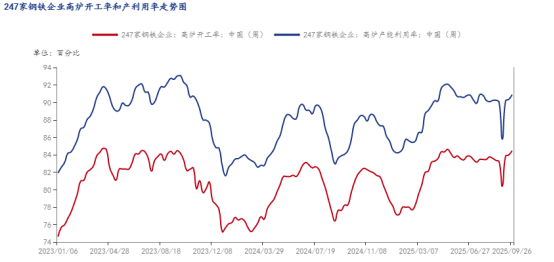 圖五:2023-2025年國內247家鋼鐵企業高爐開工率和產能利用率走勢圖
