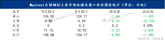 通過對全國六城20家主流倉庫及港口進行調查統計,當前9月30日鋼坯倉儲庫存136.17萬噸,周環比減少1.91萬噸。從重點區域來看,唐山鋼坯庫存124.71萬噸,周環比下降1.84萬噸。其中三大主流倉儲庫存周環比增加0.86萬噸,下游調坯廠需求減少,鋼坯倉儲庫存由降轉增。而港口庫存因為出口資源疏港下降2.7萬噸,港口庫存的下降導致唐山整體庫存的下降。