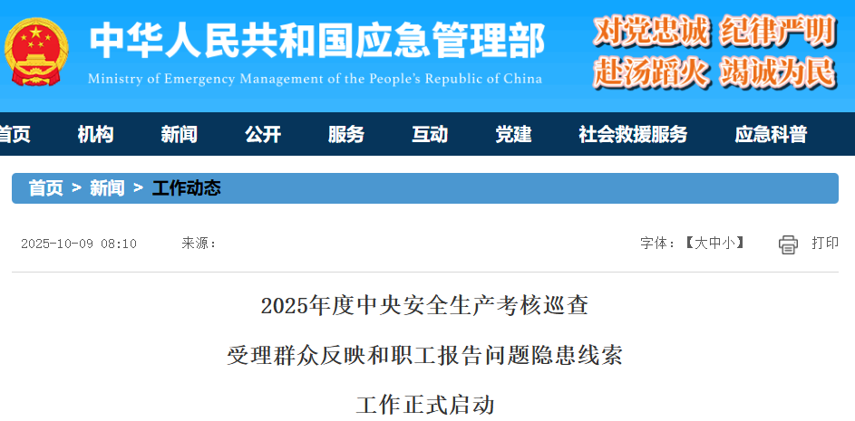 10月9日至10月31日,國務院安全生產委員會辦公室將通過互聯網、電話、信件等3種途徑,受理群眾反映和職工報告問題隱患線索。受理范圍主要包括:涉及安全生產相關的重大問題隱患、安全生產非法違法行為等,同時受理有關部門和企業一線干部職工反映各級各部門在落實安全生產責任上存在的問題、加強和改進安全生產工作的建議。