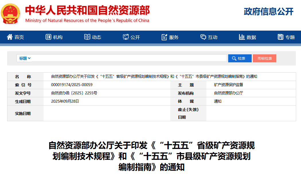 為加強部省銜接,指導做好省市縣各級礦產資源規劃工作,依據《礦產資源法》和《礦產資源規劃編制實施辦法》,按照《自然資源部辦公廳關于開展“十四五”礦產資源規劃總結評估及“十五五”規劃編制工作的通知》(自然資辦發〔2025〕19號)要求,部研究制定了《“十五五”省級礦產資源規劃編制技術規程》和《“十五五”市縣級礦產資源規劃編制指南》,現印發給你們,請參照執行。