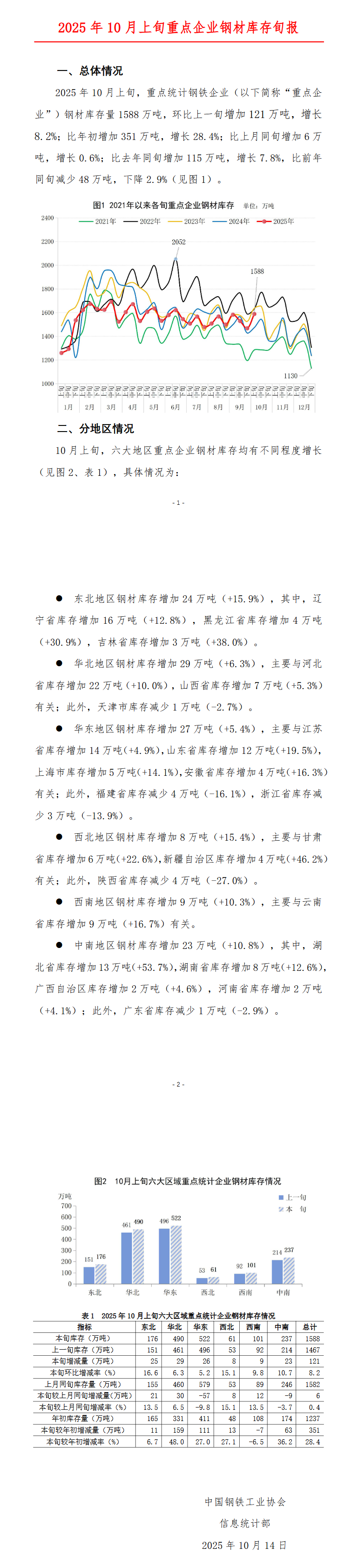 2025年10月上旬,重點統計鋼鐵企業鋼材庫存量1588萬噸,環比上一旬增加121萬噸,增長8.2%;比年初增加351萬噸,增長28.4%;比上月同旬增加6萬噸,增長0.6%;比去年同旬增加115萬噸,增長7.8%,比前年同旬減少48萬噸,下降2.9%。