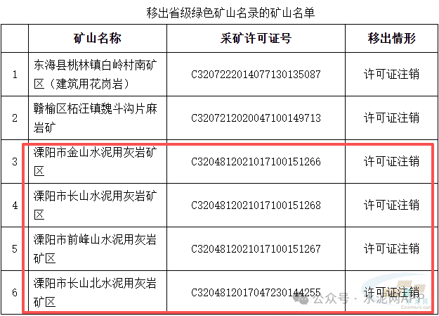 分別為溧陽市金山水泥用灰巖礦區、溧陽市長山水泥用灰巖礦區、溧陽市前峰山水泥用灰巖礦區、溧陽市長山北水泥用灰巖礦區。移出情形均為許可證注銷。