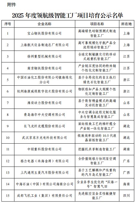 根據《關于開展2025年度智能工廠梯度培育行動的通知》(工信廳聯通裝函〔2025〕251號),現將擬入選的2025年度領航級智能工廠項目培育名單進行公示,請社會各界監督。如有異議,請在公示期內將書面意見反饋至工業和信息化部裝備工業一司(智能制造處)。