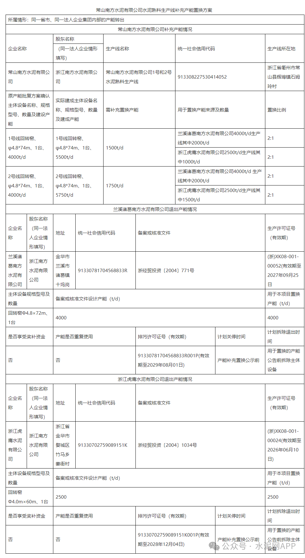 置換方案顯示,常山南方1號(hào)線回轉(zhuǎn)窯補(bǔ)充熟料產(chǎn)能1500t/d,2號(hào)線回轉(zhuǎn)窯補(bǔ)充熟料產(chǎn)能1750t/d,置換退出產(chǎn)能來自蘭溪諸葛南方一條4000t/d熟料生產(chǎn)線及浙江虎鷹水泥一條2500t/d熟料生產(chǎn)線,置換比例2:1。