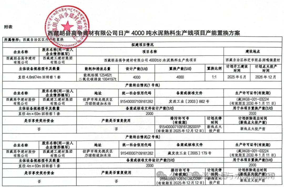 近日,西藏天路發布三季報,其中提到,2025年1月,公司控股子公司西藏高爭建材股份有限公司(持股51%)與西藏藏建水泥有限公司(持股 25%)、林芝市城市投資有限責任公司(持股13%)、朗縣城市投資有限責任公司(持股11%)共同成立了“西藏朗縣高爭建材有限公司”,注冊資本3500萬元,對外投資構成的關聯交易事項已經公司總經理辦公會審議通過。目前,西藏朗縣高爭建材有限公司通過自治區區內產能置換方式在林芝市朗縣建設一條4000t/d水泥熟料生產線項目,已完成用地預審、產能置換、項目備案、農用地轉建設用地以及礦山“兩報告一方案”評審等工作。西藏朗縣高爭建材有限公司正在辦理環評、土地使用權出讓等審批程序。據悉,4月23日,西藏經信廳發布“關于西藏朗縣高爭建材有限公司4000t/d水泥熟料生產線項目產能置換方案的公示”。
