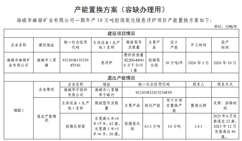 1.海城市琳麗礦業有限公司一期年產10萬噸輕燒氧化鎂懸浮爐項目產能置換方案