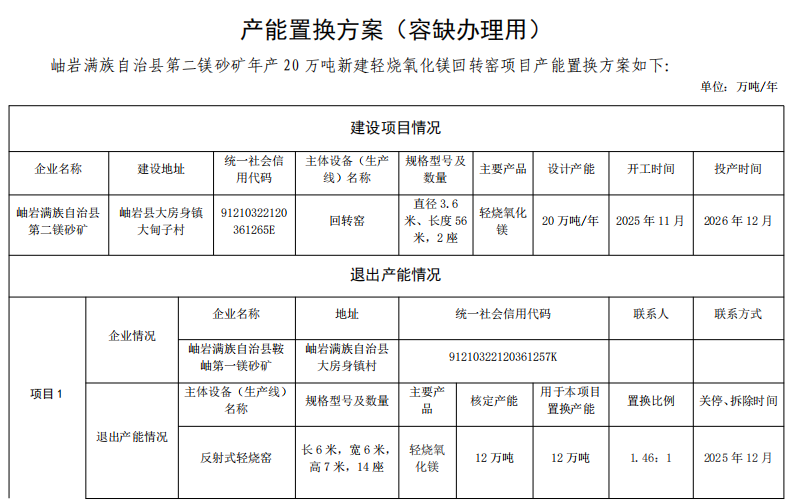 3.岫巖滿族自治縣第二鎂砂礦年產20萬噸新建輕燒氧化鎂回轉窯項目產能置換方案