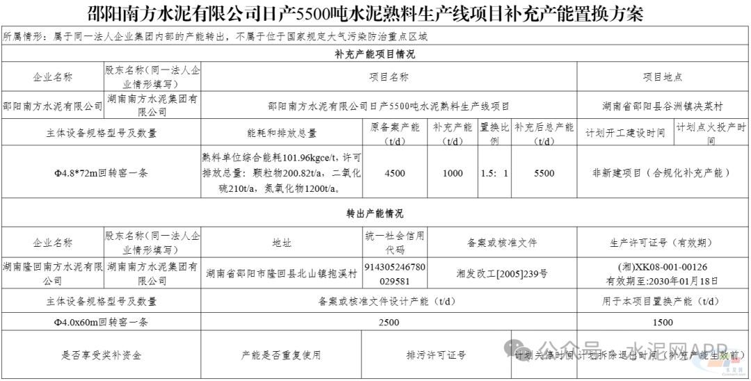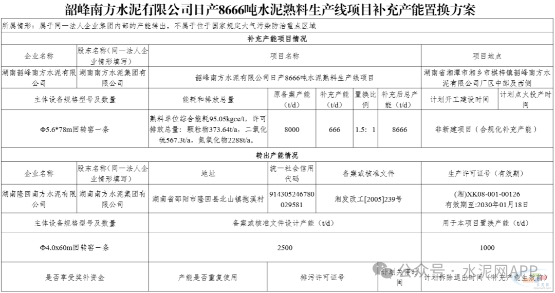 11月12日,湖南省工信廳發布“關于韶峰南方水泥有限公司、邵陽南方水泥有限公司補充產能置換方案的公示”。