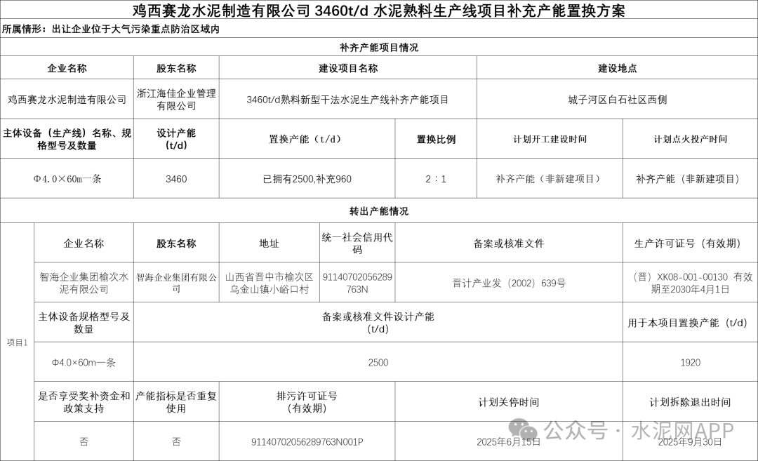 置換方案顯示,雞西賽龍水泥制造有限公司一條2500t/d熟料生產線補充產能960t/d,補充后產能3460t/d,退出產能來自智海企業集團榆次水泥有限公司一條2500t/d熟料線(用于本項目1920t/d),置換比例2:1。