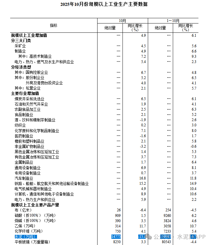其中水泥行業10月份全國水泥產量14775萬噸,下降15.8%;1-10月全國水泥產量139985萬噸,同比下降6.7%。