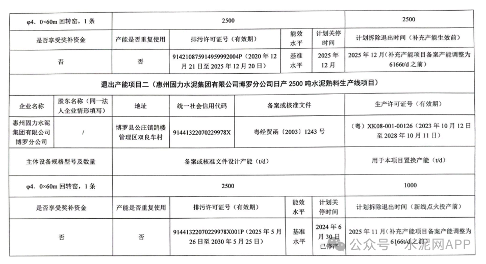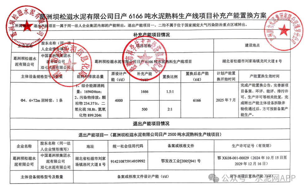 置換方案顯示,葛洲壩松滋水泥一條4000t/d熟料生產線補充產能2166t/d,補充后產能6166t/d,退出產能來自同公司一條2500t/d熟料生產線及惠州固力水泥博羅分公司一條2500t/d熟料線(用于本項目1000t/d),前者置換比例1.5:1,后者2:1。