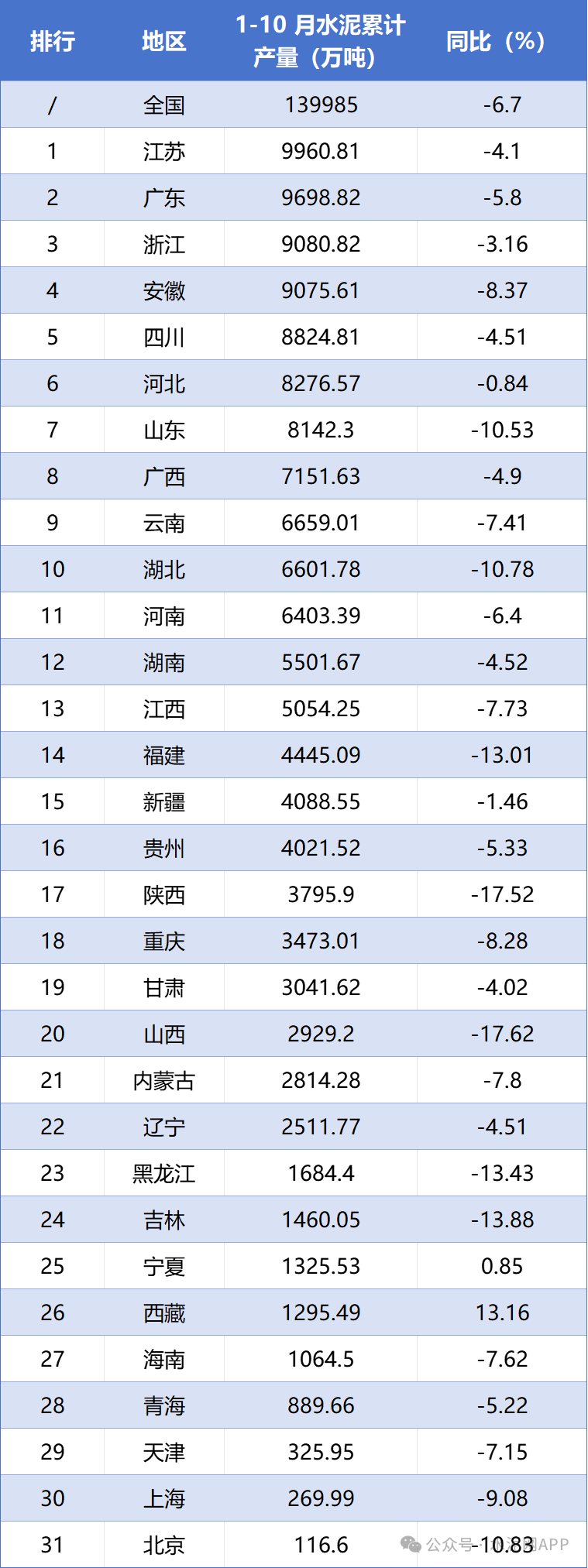 據國家統計局數據顯示,1-10月全國水泥產量139985萬噸,同比下降6.7%。從分省市數據來看,1-10月,江蘇以產量9960.81萬噸位列第一,廣東產量9698.82萬噸排在第二,浙江產量9080.82萬噸排在第三。同比方面,全國僅西藏、寧夏上升,其余地區下降,其中陜西降幅最大為 17.52%,整體水泥市場產量呈持續下行態勢。具體見下表: