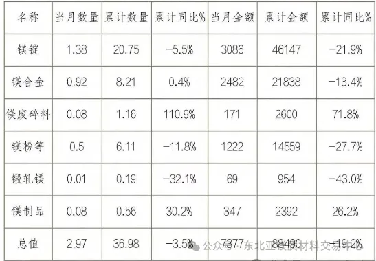 2025年1—10月中國共出口各類鎂產品約36.98萬噸,同比下降3.5%;累計金額約8.85億美元,同比下降19.2%。其中,鎂錠共出口約20.75萬噸,同比下降5.5%;鎂合金共出口約8.21萬噸,同比增長約0.4%;鎂粉共出口約6.11萬噸,同比下降11.8%。