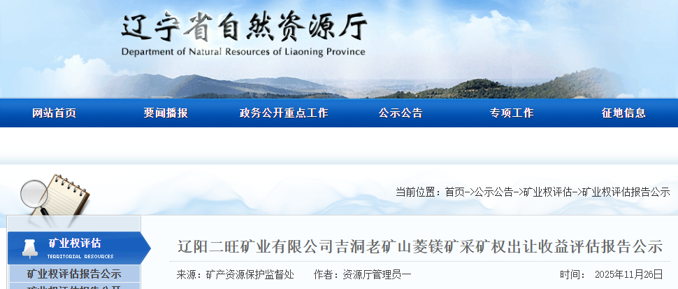 遼陽二旺礦業有限公司吉洞老礦山菱鎂礦采礦權出讓收益評估報告通過遼寧省自然資源廳門戶網站向社會公示,公示10個工作日。如有異議,請于公示之日起10個工作日內以電話方式先向省自然資源廳礦產資源保護監督處提出簡要意見,隨后及時將書面意見反饋到省自然資源廳礦產資源保護監督處。