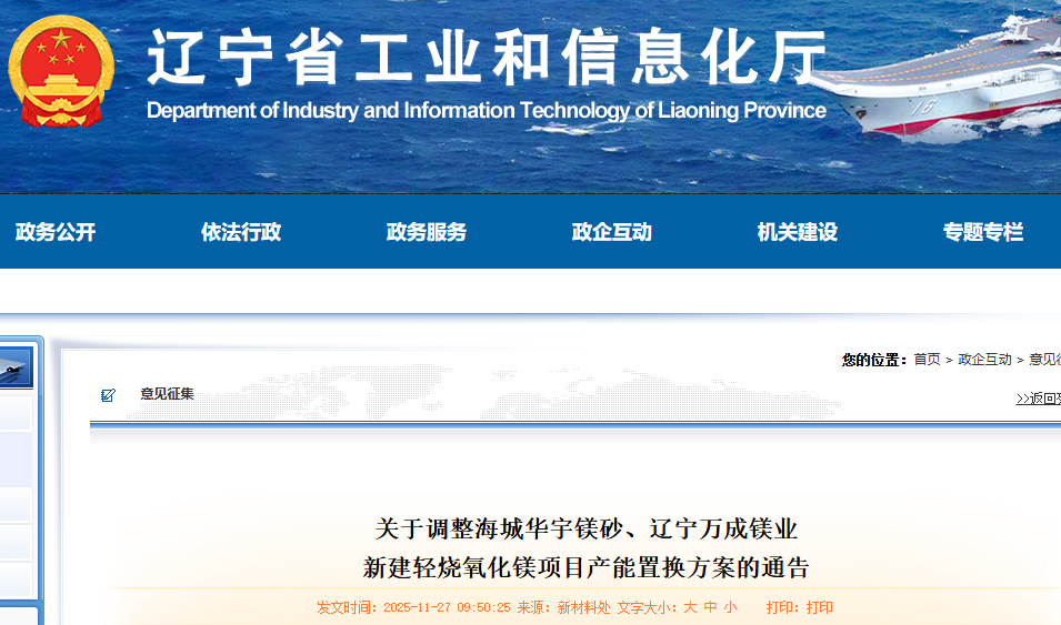 按照《遼寧省人民政府辦公廳關(guān)于推進菱鎂行業(yè)高質(zhì)量發(fā)展的實施意見》(遼政辦發(fā)〔2023〕15號)、《遼寧省菱鎂礦浮選及鎂砂行業(yè)產(chǎn)能置換辦法》(遼工信建材〔2024〕18號)要求,根據(jù)菱鎂行業(yè)專項整治工作進展,經(jīng)企業(yè)申請、市級審核、省級復核,我廳于2025年11月13日至11月26日,對海城華宇鎂砂、遼寧萬成鎂業(yè)新建輕燒氧化鎂項目產(chǎn)能置換方案進行了公示,公示期間無異議,現(xiàn)予通告。