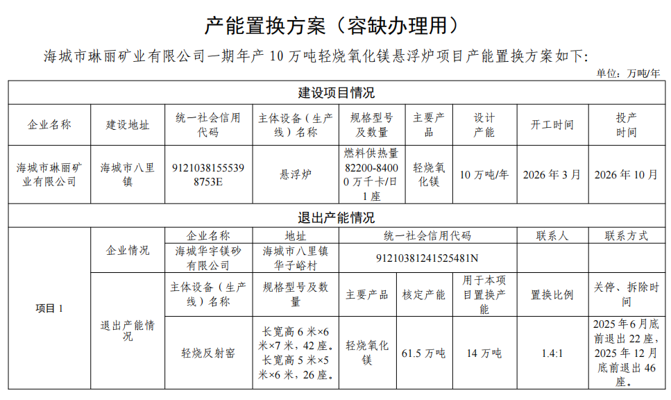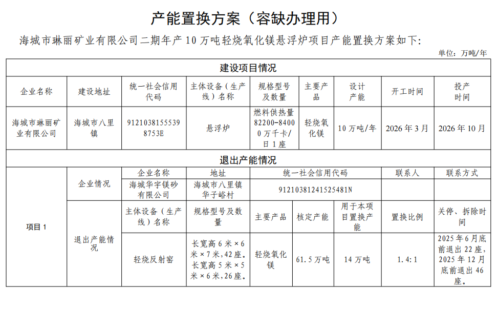 1.海城市琳麗礦業(yè)有限公司一期年產(chǎn)10萬噸輕燒氧化鎂懸浮爐項目產(chǎn)能置換方案