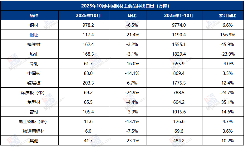 三、主要品種出口普遍回落2025年10月,中國鋼材出口各主要品種呈現(xiàn)結構性分化,多數(shù)品類出口量較上月有所回落。鍍層板成為少數(shù)實現(xiàn)環(huán)比正增長的主要品種,出口量達203.3萬噸,環(huán)比上升6.7%,已連續(xù)四個月超過熱軋板卷,居鋼材單品種出口量首位,反映其在國際市場中仍具備較強競爭力。涂層板(帶)、冷軋板及中厚板則出現(xiàn)明顯回調(diào),顯示相關下游需求有所放緩。長材方面,棒線材、角型材與管材出口量環(huán)比小幅回落,降幅在3%–4%之間,但累計同比保持穩(wěn)健增勢,反映海外基建與結構用鋼需求仍具韌性。整體來看,10月鋼材出口雖多數(shù)品種環(huán)比下降,但鍍層板、棒線材等高附加值產(chǎn)品與建筑鋼材在累計維度仍保持較好增長,表明中國鋼材出口結構正隨國際需求結構變化持續(xù)調(diào)整,不同品類對應終端市場的差異正逐步清晰。(備注:熱軋包括熱軋薄板、熱軋薄寬鋼帶、熱軋窄鋼帶和中厚寬鋼帶,冷軋包括冷軋薄板、冷軋薄寬鋼帶和冷軋窄鋼帶)