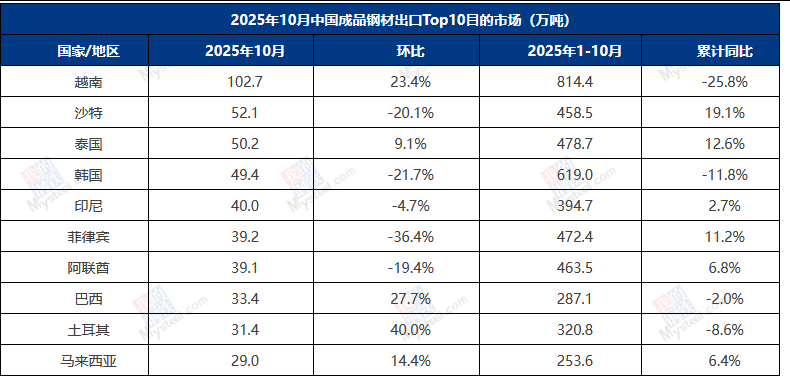 四、主要出口市場需求結構分化2025年10月,中國鋼材前十大出口目的國的進口規(guī)模出現(xiàn)明顯波動,區(qū)域間需求結構呈現(xiàn)分化態(tài)勢。從增長區(qū)域看,越南繼續(xù)保持我國鋼材第一大出口市場地位,當月進口量為102.7萬噸,環(huán)比增長23.4%,增長主要來自熱軋板卷搶出口的拉動。巴西與土耳其進口量亦顯著上升,主要受板材類產(chǎn)品訂單增加的推動。泰國與馬來西亞保持穩(wěn)定增長,主要動力來源于角型材需求的提升。在進口量下降的國家中,沙特、韓國、菲律賓、阿聯(lián)酋和印尼等地10月自中國進口鋼材規(guī)模均有不同程度回落,下降普遍集中于板材類產(chǎn)品,反映出該類產(chǎn)品在部分亞洲及中東地區(qū)出現(xiàn)階段性需求回調(diào)。從累計數(shù)據(jù)來看,1–10月我國對越南出口累計同比仍下降25.8%,反映其整體需求尚未恢復至去年同期水平;而對泰國、菲律賓等國的累計出口仍保持兩位數(shù)增長,表明我國鋼材出口格局正在向需求更為活躍的新興市場和復蘇區(qū)域調(diào)整。總體而言,10月中國鋼材出口的區(qū)域變化不僅源于短期訂單波動,更折射出全球鋼材消費市場正在經(jīng)歷結構性轉變與區(qū)域需求輪動。