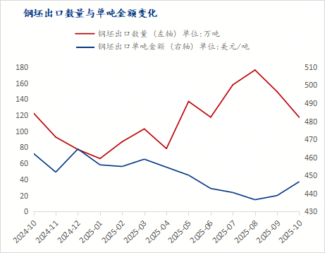 2、10月鋼坯出口單噸金額小幅上漲2025年10月,中國鋼坯出口均價為446.5美元/噸,環(huán)比上漲8美元/噸,同比下跌16美元/噸。盡管月度價格有所回升,但是整體仍處于低位區(qū)間運行,顯示出中國鋼坯在國際市場上具備持續(xù)的價格競爭力。