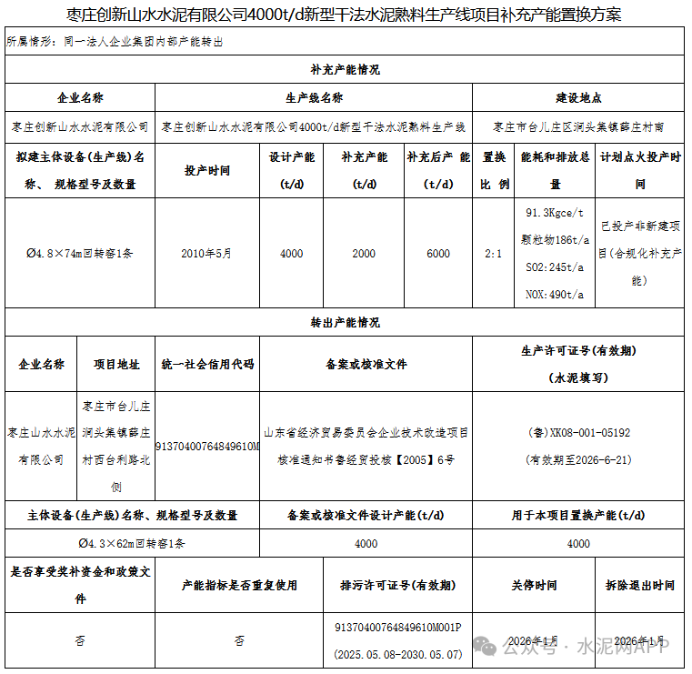 置換方案顯示,棗莊創新山水水泥4000t/d熟料生產線補充產能2000t/d,補充后產能6000t/d,退出產能來自棗莊山水水泥4000t/d熟料生產線,置換比例2:1。