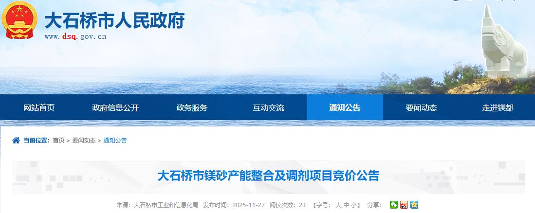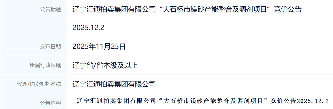 為貫徹落實大石橋市菱鎂產業結構調整與轉型升級的戰略部署,優化資源配置,實現高質量發展。根據大石橋市鎂砂產能整合及調劑工作的總體安排,大石橋市政府責成大石橋市工業和信息化局委托遼寧匯通拍賣集團有限公司,就已列入大石橋市850萬噸壓減目標以及完成產能整合且已在大石橋市工業和信息化局報備的整合方企業,擬于2025年12月2日組織公開競價活動,以確定產能整合及調劑的受讓方及補償金額。