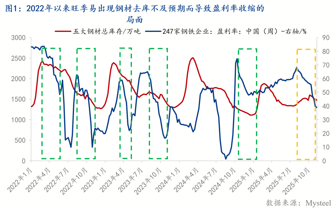 隨著金九銀十旺季逝去,鋼鐵行業在需求淡季的拖累之下,鋼材去庫壓力已然顯現,因此負反饋邏輯成為當前鋼市運行的主要邏輯。結合2022年以來的每年經驗來看,鋼市負反饋行情易發現在旺季時段(金三銀四和金九銀十期間);那么導致負反饋行情最根本的原因:我們認為在于旺季鋼材去庫不及預期(下圖1所示)。